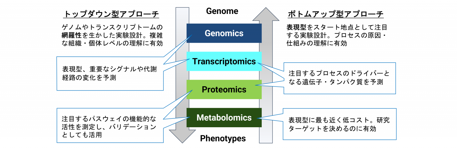 複数のオミクスデータを活用することで、バリデーションとしての仮説の補強や、統合解析の実施が可能となります。複数の階層のオミクス解析を組み合わせることは、疾患のような複雑系における症状の起こるメカニズムの理解、マーカーや治療標的候補の探索に有用です。