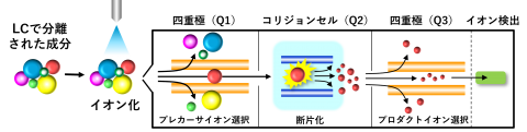 Q1で目的のプレカーサイオンを選択し、続くコリジョンセルで不活性化ガスと衝突させ断片化します。さらにQ3でプロダクトイオンを選択することにより、高選択性・高感度の定量分析が可能になります。このように、LC分離、分子量分離、部分構造分離の3つのフィルターにより、高い特異度(目的の分子だけを正確に測定する)で分析します。